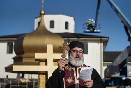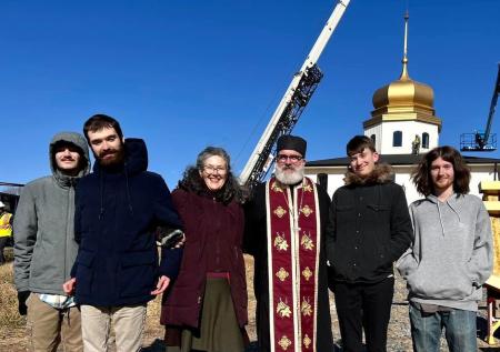 Fr Chris and Mka Carrie watch as the cross is lifted onto the dome of the new Holy Cross Orthodox Church, November 2023
