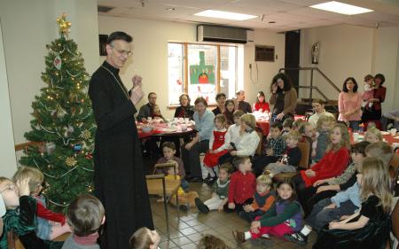 Fr Paul Lazor tells seminary children the story of St Nicholas in December 2004; Mka Carrie is standing in the back left of the photo.