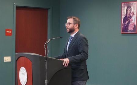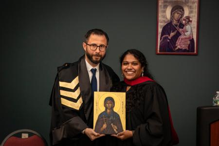 MAY: During the Commencement ceremony, Student Council President Kripaya Varghese (M.A. ‘24) presented the Saint Macrina Award to Academic Dean Dr Ionuț-Alexandru Tudorie. The Saint Macrina Award is an honor given each year to a professor elected by the student body to recognize his or her effort and excellence in teaching.