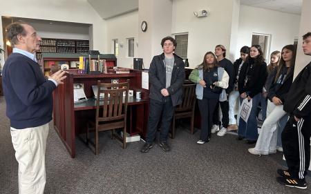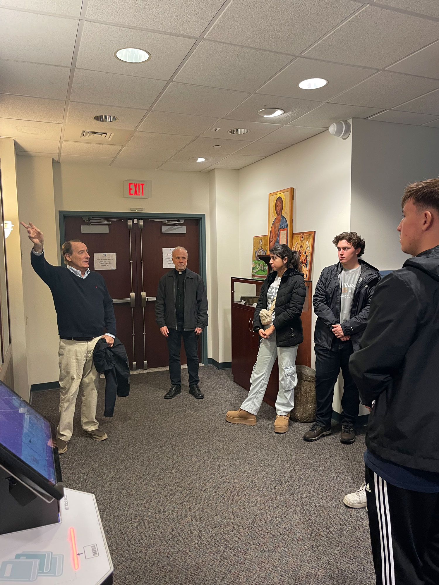 The youth group and seminarians enjoyed lunch together in the refectory in the Germack building and then were treated to a tour of the Father Georges Florovsky Library, given by senior staff member and former SVS Press Director, Ted Bazil. During the tour, one of the students, a grandson of longtime seminary benefactor and former trustee Obren Brian Gerich (Doctor of Humane Letters, honoris causa), was able to get a photo with the plaque bearing his grandparents' names as sponsors of the Seminary Board Room. The youth group also made a stop in Three Hierarchs Chapel, where they sang two hymns, "Holy God" and "Praise the Lord,” a special treat for everyone.
