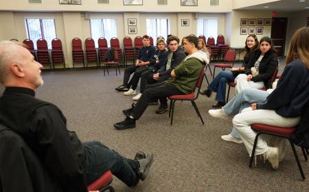 Just after Christmas, St Vladimir’s Seminary had the joy of hosting the youth group from St Steven’s Serbian Orthodox Cathedral in Alhambra, CA, led by their cathedral dean and SVOTS alumnus Fr Nicholas Ceko (M.Div. ‘85). The youth were met first by four seminarians, Paisius Bradley Winsler (M.A. ‘24), Sergio Hector Lopez (M.Div. ‘26), Pavlo Kurganov (M.A. ‘24), and Silouan Jovani Valdez (M.A. ‘24), who sat down with them to talk about seminary life and their own backgrounds and reasons for pursuing a vocation within the Church. Seminarians took questions from the youth group members and spoke candidly about past experiences of conversion, the struggles and joys of attending seminary, and the redemptive nature of life within community in prayer and service.