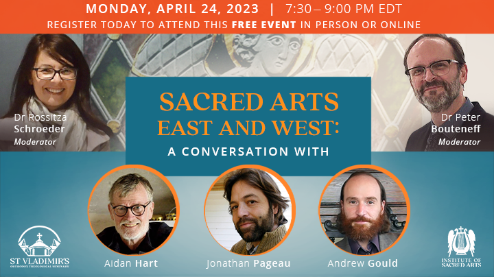The Institute of Sacred Arts (ISA) at St Vladimir’s Orthodox Theological Seminary (SVOTS) will host a panel discussion with artists and scholars Aidan Hart, Jonathan Pageau, and Andrew Gould, on Monday, April 24, 2023, at 7:30 p.m. The event will be moderated by ISA founding director and SVOTS Professor of Systematic Theology Dr Peter Bouteneff and Associate Professor of Art History Dr Rossitza Schroeder.