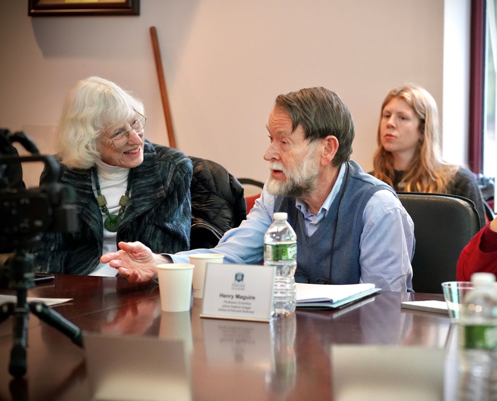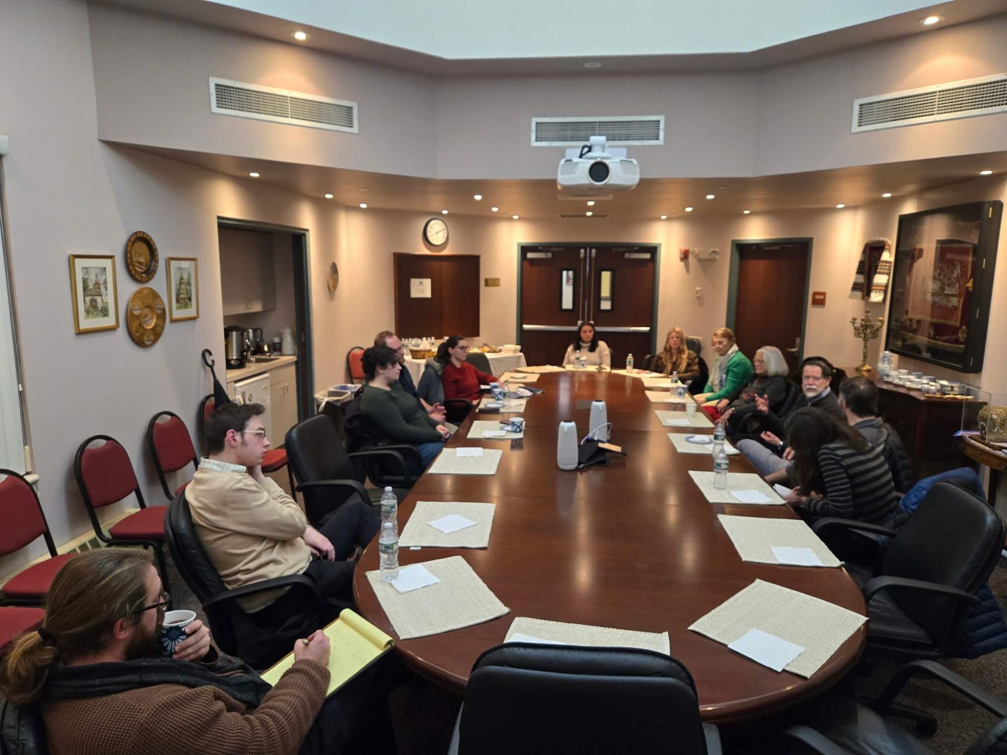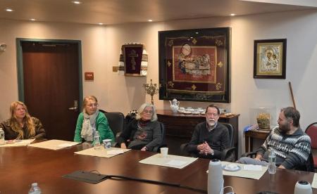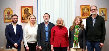 In the week following the Schmemann Lecture, Dr Henry and Dr Eunice Maguire remained on campus to engage with seminary faculty and students further to discuss the sacred arts. In addition to individual meetings with students and faculty, the Maguires led a colloquium on the sacred arts on Friday, January 31, attended by distinguished invited guests: Robert Nelson, Emeritus Professor of Art History at Yale University, Annemarie Weyl Carr, Emerita University Distinguished Professor at Southern Methodist University, Vasileos Marinis, Professor of Christian Art and Architecture at Yale Divinity School. These joined seminary faculty Dr Ionuț-Alexandru Tudorie, Dr Peter Bouteneff, Dr Rossitza Schroeder, Dr Alexander Lingas, the Rev. Hieromonk Dr Vasily Permiakov, the Very Rev. Dr Bogdan Bucur, the Rev. Dr Sergius Halvorsen, the Rev. Dn Dr Harrison Basil Russin, Dr Ani Shahinian, together with Fr Lucas Christensen, distinguished sacred arts supporter Joan Shell, and select seminarians and community members. Following the colloquium on Friday, students were provided another opportunity to connect with Dr Henry and Dr Eunice Maguire in an evening "fireside chat" over tea and pastries on Monday, February 3.