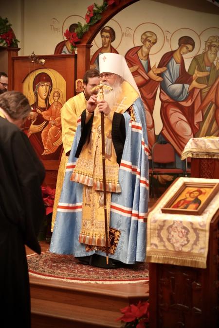 His Beatitude Met. Tikhon blesses the congregation at Three Hierarchs Chapel on the eve of its patronal feast. Photo: Scott Strickland