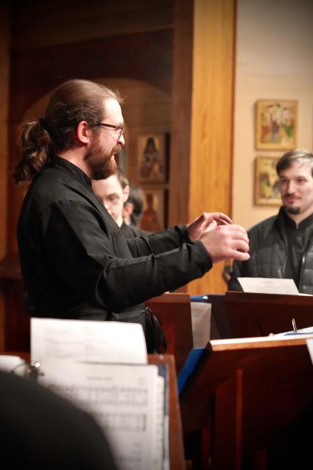 Zachariah Mandell directs the newly reestablished St Vladimir’s Seminary Chorale for Matins of the chapel feast, the first time the current ensemble has sung in public. Photo: Scott Strickland
