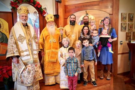 From left: His Grace Bishop Irinej, His Beatitude Metropolitan Tikhon, the newly ordained Fr Justin and Dn John, and their families. Photo: Scott Strickland