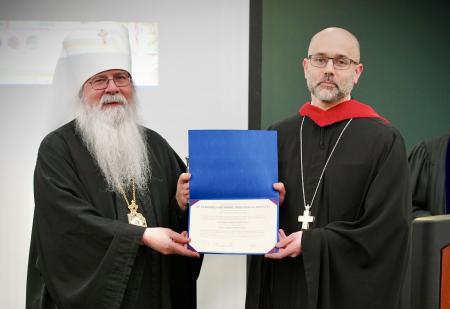 Acting Chancellor of the OCA, the Very Rev. Dr Alessandro Margheritino (D.Min. ‘24), receiving his Doctor of Ministry diploma. Photo: Scott Strickland