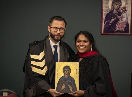 2024 Student Council President, Kripaya Varghese (M.A. ‘24) presents Dr Tudorie with the St Macrina Award