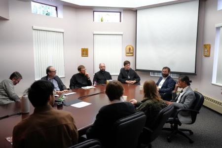 In the week following the Schmemann Lecture, Dr Henry and Dr Eunice Maguire remained on campus to engage with seminary faculty and students further to discuss the sacred arts. In addition to individual meetings with students and faculty, the Maguires led a colloquium on the sacred arts on Friday, January 31, attended by distinguished invited guests: Robert Nelson, Emeritus Professor of Art History at Yale University, Annemarie Weyl Carr, Emerita University Distinguished Professor at Southern Methodist University, Vasileos Marinis, Professor of Christian Art and Architecture at Yale Divinity School. These joined seminary faculty Dr Ionuț-Alexandru Tudorie, Dr Peter Bouteneff, Dr Rossitza Schroeder, Dr Alexander Lingas, the Rev. Hieromonk Dr Vasily Permiakov, the Very Rev. Dr Bogdan Bucur, the Rev. Dr Sergius Halvorsen, the Rev. Dn Dr Harrison Basil Russin, Dr Ani Shahinian, together with Fr Lucas Christensen, distinguished sacred arts supporter Joan Shell, and select seminarians and community members. Following the colloquium on Friday, students were provided another opportunity to connect with Dr Henry and Dr Eunice Maguire in an evening "fireside chat" over tea and pastries on Monday, February 3.