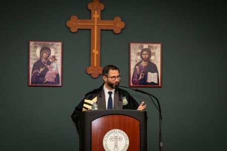 Following the Schmemann lecture, three graduates received their diplomas during the Midyear Commencement: Dn Habib (Caleb McGee; M.Div. ‘24), Sdn Christopher Abdelahad (M.A. ‘24), and the Very Rev. Dr Alessandro Margheritino (D.Min. ‘24), Acting Chancellor of the OCA. Fr Dr Alessandro gave a brief presentation about his participation in the Doctor of Ministry program at SVOTS, reflecting, “People pursue the D.Min. program for various reasons, to challenge themselves academically, to enhance their ministry, to become better priests, chaplains, administrators, youth pastors, counselors and so on. However, throughout this demanding journey, I've been continuously reminded of the foundational purpose of this, this formation to become a better servant of Christ and His Holy Church, irrespective of our specific ministry."
