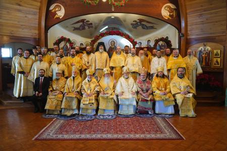 His Beatitude Metropolitan Tikhon, Archbishop of Washington, Metropolitan of All America and Canada, and President of St. Vladimir’s Seminary, presided over Divine Liturgy at the Seminary’s Three Hierarchs Chapel. Joining His Beatitude were His Eminence Archbishop Michael of New York and the Diocese of New York and New Jersey (OCA); His Grace Bishop John (SVOTS Class of ’84) of Worcester and New England (Antiochian Archdiocese); His Grace Bishop Irinej (’82) of Washington-New York and Eastern America (Serbian Orthodox Church); His Grace Bishop Nikodhim (’07) of Boston and the Albanian Archdiocese (OCA); His Grace Bishop Benedict (’10) of Hartford and New England (OCA); and His Grace Bishop Vasily (’04) of San Francisco and the West (OCA). Among the priests present were—including Seminary clergy, guests, and alumni—Archpriest Alessandro Margheritino (’14 and ’25), Chancellor of the Orthodox Church in America; Three Hierarchs Chapel Rector Archpriest Alexander Rentel (’95), SVOTS’ Assistant Professor of Liturgical Theology and Canon Law; Protopresbyter Nicolas Kazarian, Ecumenical Officer and Director of the Department of Inter-Orthodox Ecumenical and Interfaith Relations (Greek Orthodox Archdiocese of America); Archimandrite Jeremy (Davis; ’04), Archiepiscopal Vicar, Diocese of Toledo and the Midwest (Antiochian Archdiocese), and Seminary Trustee; Archpriest Andrew Louth, Archpriest Emeritus of the Diocese of Sourozh (Moscow Patriarchate); Seminary Spiritual Formation Director Archpriest Michael Nasser; Archpriest Volodymyr Zablotskyy, the Rector of Holy Trinity Orthodox Church in Yonkers, NY; and Archpriest Bogdan Bucur, SVOTS’ Associate Professor of Patristics.