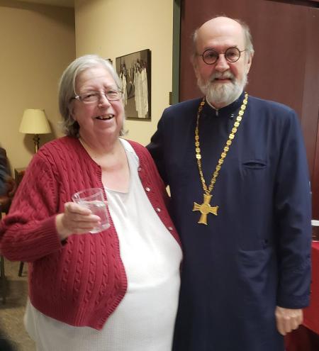 Eleana with Fr. Chad Hatfield at her retirement celebration at St. Vladimir’s Seminary in 2019.