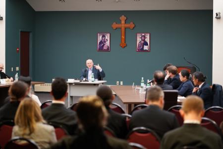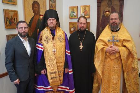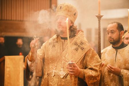 Bishop Vasily (M.Div., '04) returned to campus for the first time since his ordination to the episcopate in August. His Grace served as a full-time member of the Seminary’s faculty leading up to his ordination, and now continues as part-time faculty as he oversees the Orthodox Church in America’s Diocese of the West. On Saturday, November 8, Bishop Vasily joined the Seminary community at Three Hierarchs Chapel for the Feast of the Synaxis of the Holy Archangels and the Bodiless Powers of Heaven. The festal celebration was further blessed by the presence of another beloved faculty member and alumnus, Archpriest Kirill Sokolov (M.Div., '07), who flew in from California for the intensive week of the Doctor of Ministry (D.Min.) program. Bishop Vasily then presided over Hierarchical Divine Liturgy the next day on campus.