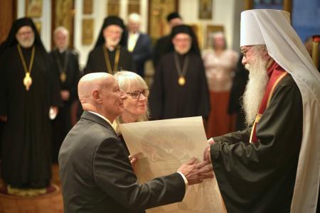 “On these sacred grounds, you offered yourself, not primarily to buildings and facilities, but rather to the human persons who lived, labored and prayed here,” remarked His Beatitude. “Successive generations of these many constituents have come to know Ted, along with your faithful wife, Claudia, as a pillar of St. Vladimir's Seminary and its mission. But beyond these sacred grounds, you have become known to the wider Church—bishops, priests, deacons, and faithful from many parishes and missions—as an advocate for the work of the local Church here in North America.”